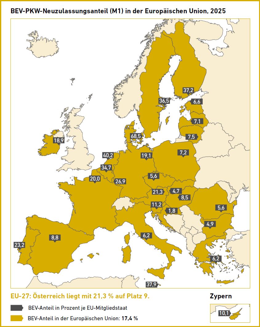 Ein wesentlicher Teil des europäischen Gesamtwachstums in absoluten Zahlen ist auf einige der größten Automobilmärkte zurückzuführen. Deutschland verzeichnete 2025 über 545.000 neu zugelassene BEV-PKW, ein Zuwachs von mehr als 43 % gegenüber dem Vorjahr. Spanien konnte seine BEV-Neuzulassungen sogar um 77 % steigern, während Polen mit einem Plus von über 160 % den stärksten relativen Zuwachs aller EU-Mitgliedstaaten verzeichnete – wenn auch von einem noch niedrigen Ausgangsniveau (in Polen wurden 2025 weniger E-PKW zugelassen als in Österreich – trotz vielfach größeren Gesamtmarkts).