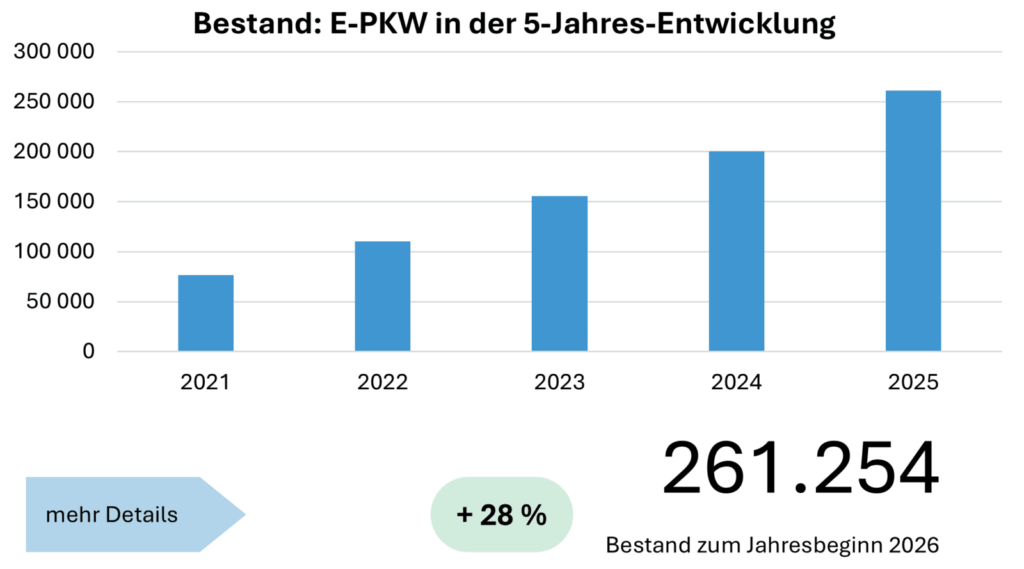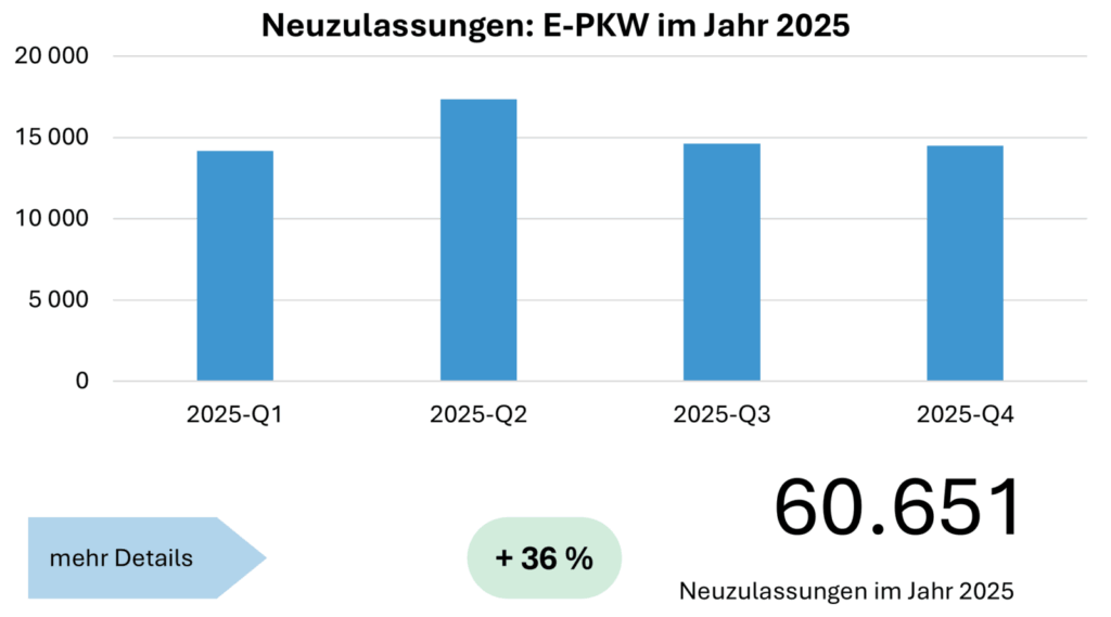 2025 wurden in Österreich erstmals mehr batterieelektrische PKW (BEV) als Diesel neu zugelassen. Der BEV-Anteil bei den neuen PKW liegt aktuell bei 21 % – deutlich über dem EU-Schnitt. Besonders stark ist der Anstieg bei privaten Neuzulassungen: 2025 wurden um 72 % mehr E-PKW von Haushalten zugelassen als noch im Jahr zuvor!