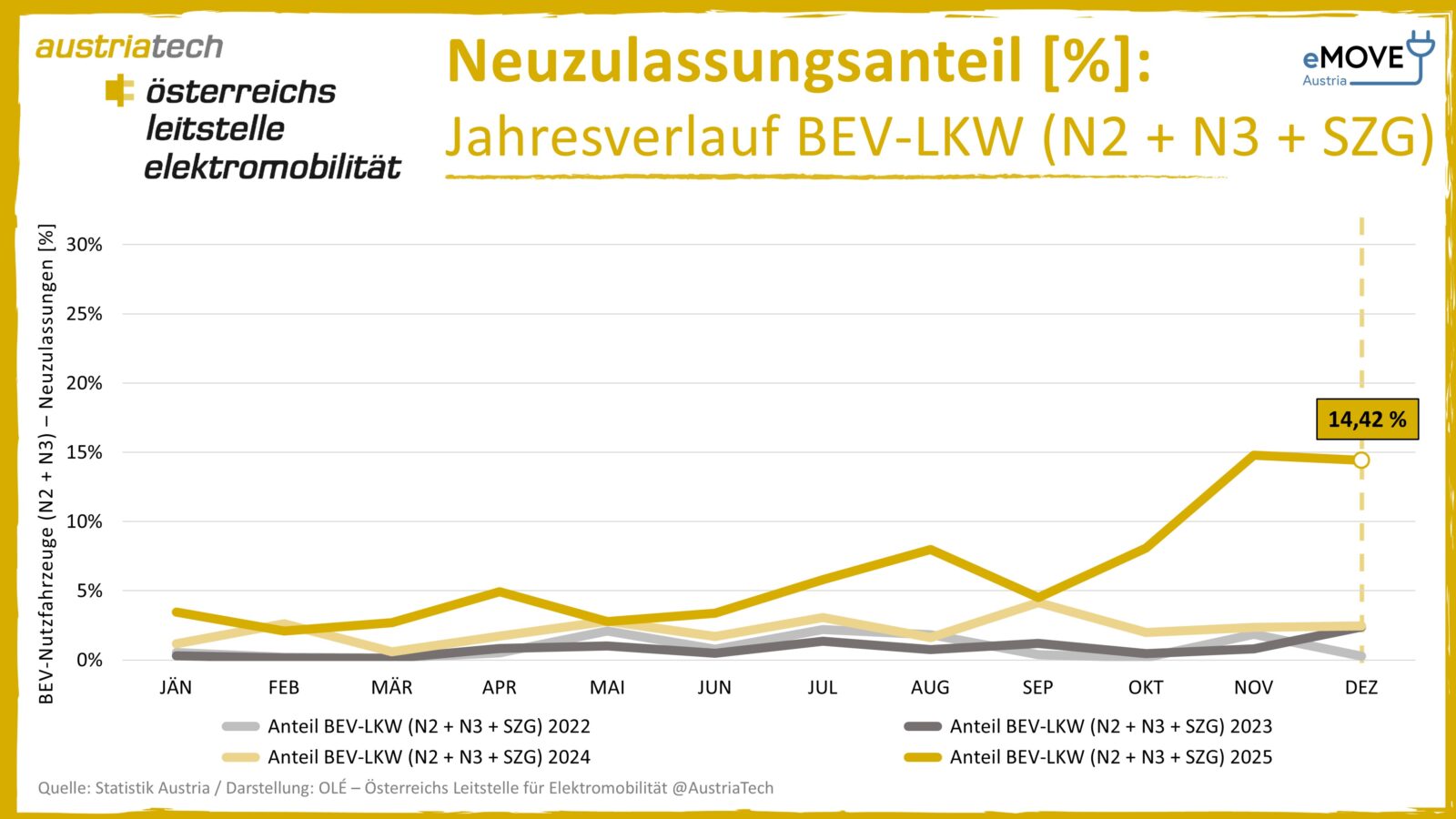 Bei schweren batterieelektrischen LKW (N2, N3 und Sattelzüge) erhöhte sich der Bestand im selben Zeitraum von 59 über 167 auf 405 Fahrzeuge. Diese Entwicklung deutet auf einen Übergang von vereinzelten Pilotprojekten hin zu einer breiteren Marktdurchdringung und zunehmender Systemintegration hin. Vor dem Hintergrund des Ausbaus der (LKW-)Ladeinfrastruktur, steigender BEV-Anteile im Fahrzeugmarkt sowie wachsender elektrischer Flotten im Personen- und Güterverkehr ergibt sich für Österreich zu Beginn des Jahres 2026 eine belastbare Ausgangslage für die weitere Entwicklung der Elektromobilität.