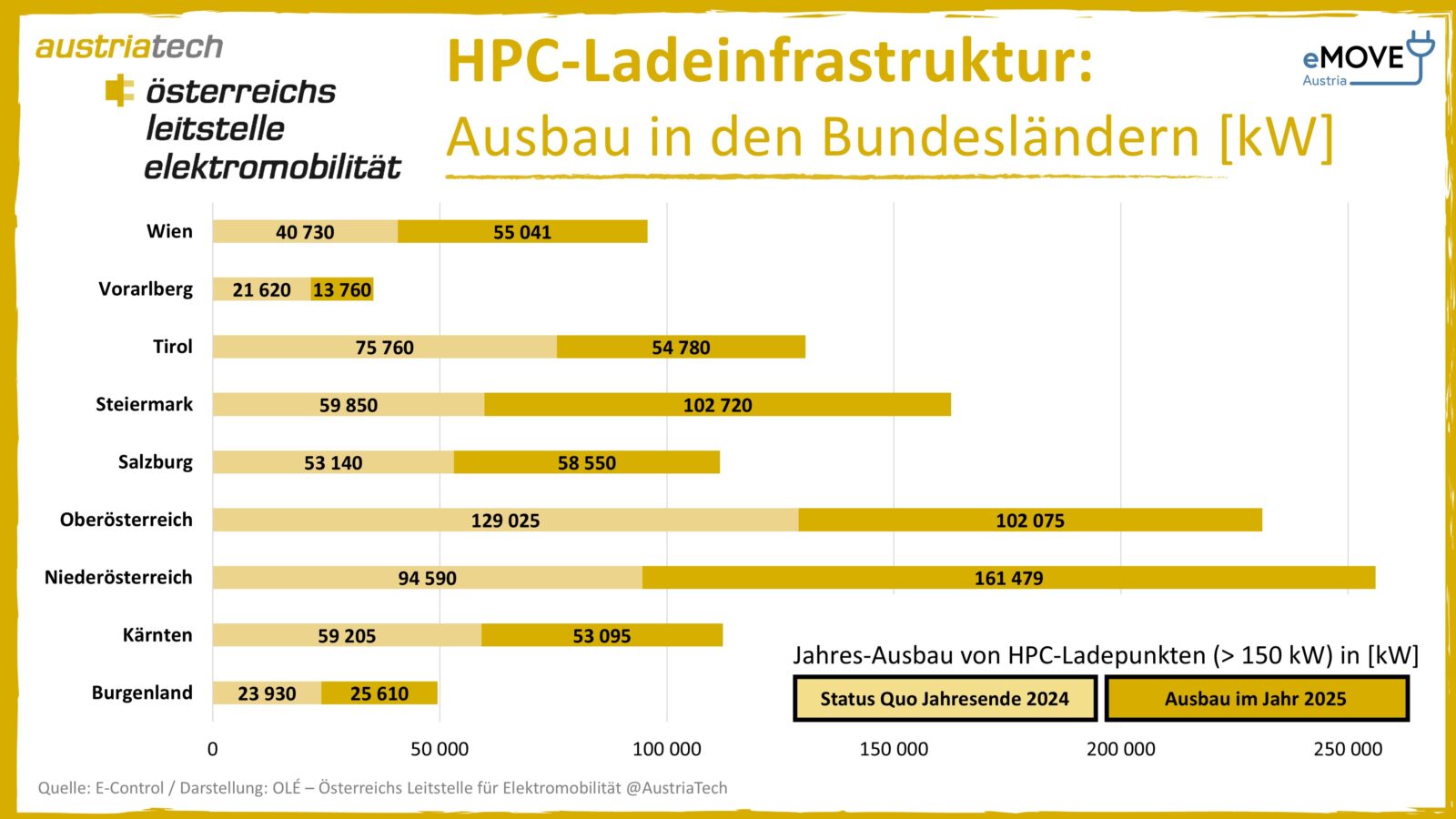 Beim Ausbau der öffentlichen Ladeinfrastruktur wurde innerhalb von nur eineinhalb Jahren die installierte Gesamtleistung von unter 1 auf über 2 Gigawatt verdoppelt. Besonders stark wuchs dabei die Ultraschnellladeinfrastruktur – von uns als „High-Power-Charger“ (HPC) klassifiziert: Die installierte HPC-Leistung (>150 kW) stieg innerhalb von zwölf Monaten von 558 MW (Megawatt) auf 1.185 MW. Österreichweit kamen allein 2025 über 600 MW neue HPC-Leistung hinzu, mit besonders starken absoluten Zuwächsen in Niederösterreich, der Steiermark und Oberösterreich. Relativ verzeichneten die Steiermark (+172 %), Niederösterreich (+171 %) und Wien (+135 %) die höchsten Wachstumsraten.
